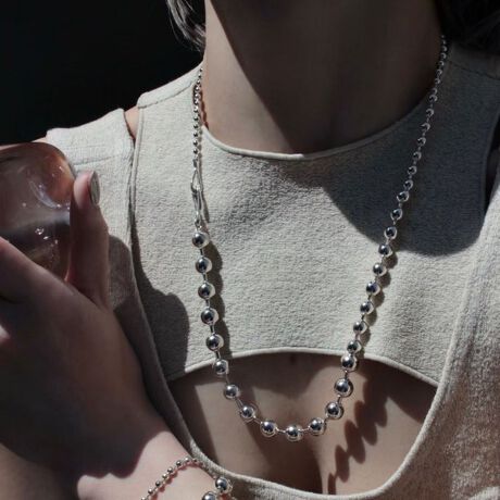 大・中・小のメタルボールを並べたネックレス。