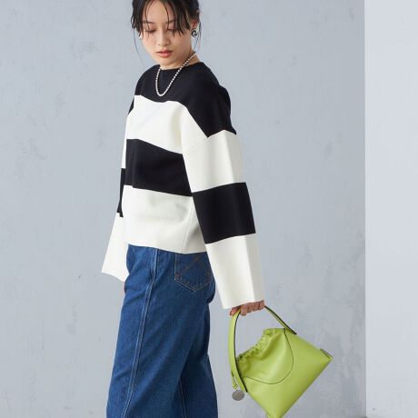 短めの丈に太ピッチのボーダーとのバランスが絶妙で、カジュアルになりすぎないデザインが魅力のアイテムです。