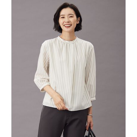 襟に小さめのメタル釦をアクセントにした、アシンメトリーの開き仕様のバンドカラーカットソー。襟元のギャザーがフェミニンな印象で、袖丈は手首の見える8分袖のため端境期にも活躍します。表地が少しシアーな素材ですが、身頃をさらっとしたジャージ裏地にしているので透け感を気にすることなく、安心してご着用いただけます。袖は裏地がないため動きやすく、重くなりがちな秋冬の着こなしに鮮度を出してくれるアイテムです。