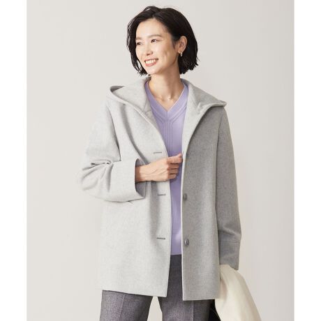 程よいラフ感のあるシルエットで、気軽に羽織れるフード付きコート。きちんとした印象にするため、前を釦留めにしています。ヒップが隠れるくらいのミドル丈で暖かく、ボトムスも選びません。お出かけの際もサッと着用できて動きやすいので日常遣いに最適。カジュアルにもきれいめにもどちらも着回せる、この冬1枚あると便利なアイテム。総裏ありです。カラーは、シックなダークグリーン(#065)と洗練されたライトグレー(#003)、柔らかい印象のベージュ(#033)、上品なネイビー(#075)の4色展開です。