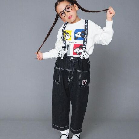 【MONOTONE MICKEY】サスペンダー付きのブラックデニムパンツ。サスペンダーは手持ちの他のパンツと合わせることができます。ミッキーの手のモチーフがポップですがブラックデニムに合わせることで子供っぽさを少し押さえました。デニムは少しゆったりしたデザインでシルエットがかわいいです。