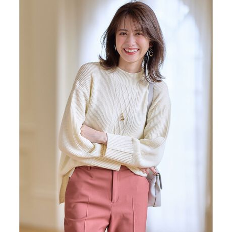 ふんわりとした風合いと毛玉になりにくい素材が魅力のスフレニットシリーズパンツスタイルにおすすめ!きれいめカジュアルなアラン柄ニット