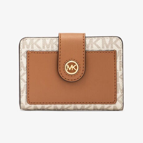 片手に収まる可愛いサイズ感とは裏腹に、高い収納力を発揮する MK CHARM タブ コンパクト ポケット ウォレット スモール。二つ折りのコンパクトなボディは、豊富なカードスロットやポケットに加えコインケースまで内蔵した機能的な作りになっています。スナップボタンにあしらった可憐なMK チャームがエレガントなアクセントに。