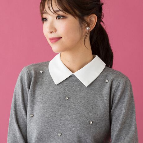 取り外し可能な襟とビジューで大人シックに仕上げたニットプルオーバー。
