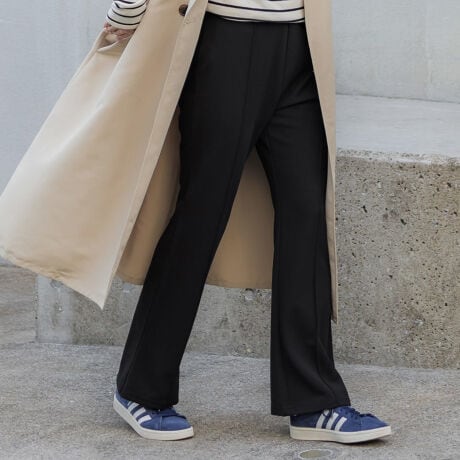 ジョーゼット生地の裏起毛素材を使用したピンタックフレアパンツ。