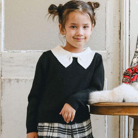 フロントを帯でしぼったリボンのようなシルエットがかわいい大きな襟のニットプルオーバー。