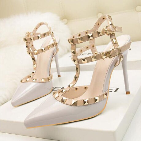 ピラミッドスタッズデザインが人目を惹いてしまうアンクルストラップピンヒールパンプス
