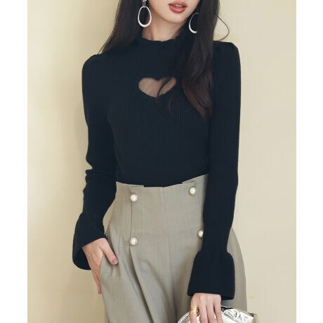 胸元のハートの透け感で魅せる大人のフェミニンリブ編みニットプルオーバー。