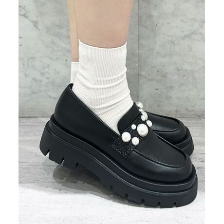 ベルト部分にラメをあしらって少しラブリーな印象のローファーはラメ靴下やリブ靴下とも相性◎