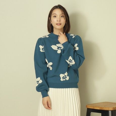 柔らかなタッチ感の編地に、膨れジャカード編みで立体感のある花柄を表現。
