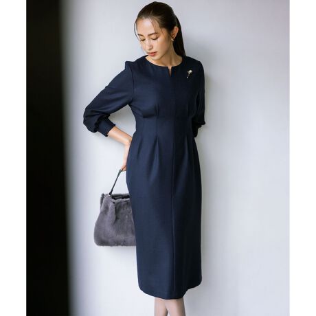 ■デザイン首元が綺麗にみえるスリットネックデザインのワンピース。ウェストよりも高い位置にデザインダーツを入れることで、程よいゆとりはありながらも着るだけで綺麗なシルエットが出ます。合わせる小物次第でデイリー使いから華やぎシーンまで活躍してくれる上品なワンピースです。