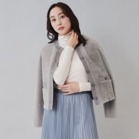中肉感のシャギーモール使いのジャケットライクなニットカーディガン。