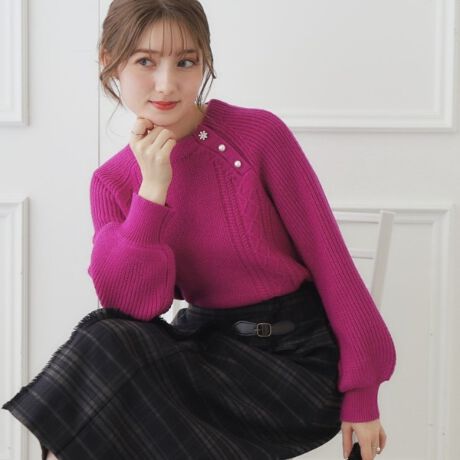 ほどよくゆったり、ふんわりパフ袖とネックの飾りボタンが華やかなニットトップス