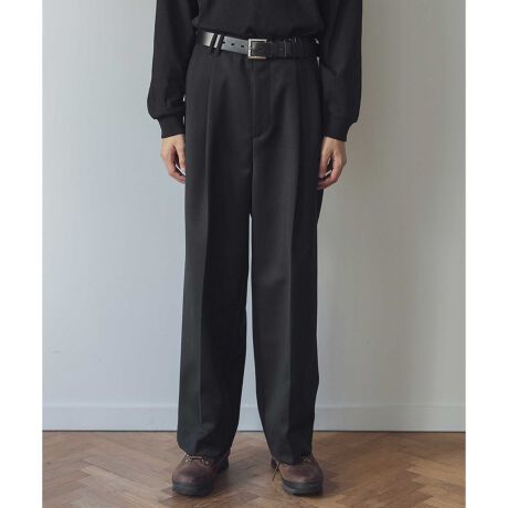 <monkey time>定番で毎年ご好評を頂いている2プリーツのワイドパンツをベースに、素材を毛/ポリエステルの肉厚なキャバリーツイルにアレンジし真冬でも着用できるアイテムにアップデート。