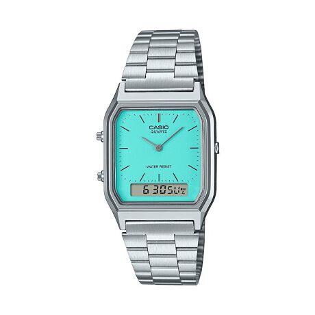 ベースモデルは、角形フェイスにアナログ時計とデジタル表示を組み合わせた人気のAQ-230。