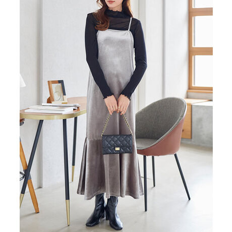 ほどよい光沢感のある生地感が魅力的なキャミワンピース。足元に向かって広がるフレアの裾デザインが歩くたびに揺れる女性らしいアイテムです。