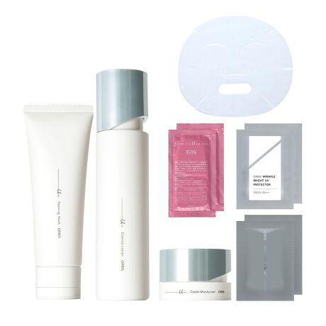 上向き(*1)のハリと透明感(*2)美白(*3)も叶える、最高峰(*4)エイジングケア(*5)の「オルビス ユードット」シリーズの洗顔・化粧水・保湿液に、オルビスユードットエッセンスローションの成分をひたひたにしみ込ませたオルビスユードットマスク、シワ改善&美白(*3)を叶えるリンクルブライトシリーズの美容液「リンクルブライトセラム」サンプルと薬用日焼け止め「リンクルブライトUVプロテクター」サンプル、傷んだ髪を芯から補修する「エッセンスインヘアミルク」サンプルがついた特別セットです。