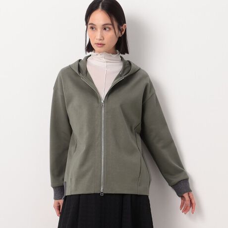脇線を前に移動させてくることですっきり見えを実現、着やすいのに大きくみえないきれいな質感のパーカです。