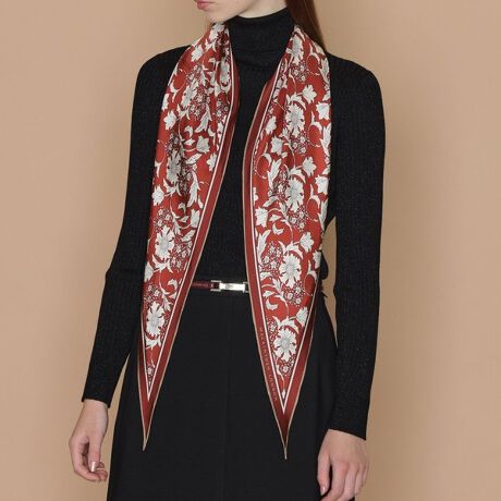 リニューアルしたニューバイブリーフラワープリントの菱形スカーフです。上品な光沢のある12匁シルクツイルを使用しています。首に1回結んで垂らしたり、二重巻にして短く結んだりとアレンジして着用いただけます。また、バッグや帽子に結んだり、ヘアアクセサリーとして髪に結んでも。熟練した職人が手捺染で丁寧にプリントしています。また、出来る職人がほぼいないと言われるバイヤス地の手巻きを、職人が希少な技術で手巻したHAND MADE IN JAPANのスカーフです。