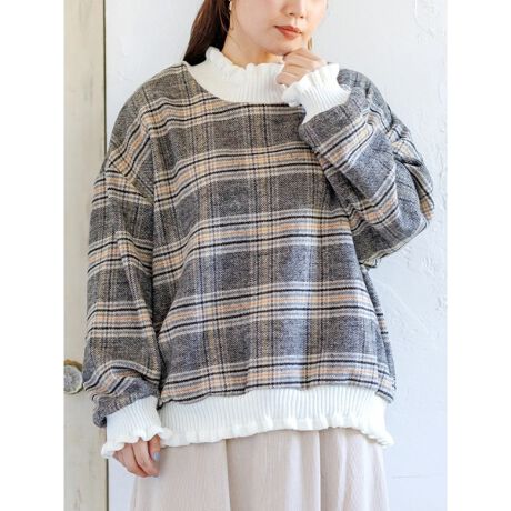 フリルリブのコンビネーションが愛らしい表情をプラスするツイードニットプルオーバー。