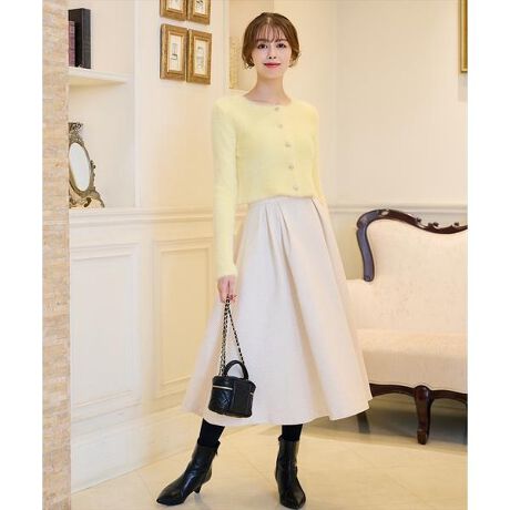 【起毛感のあるふっくらとした糸で編んだツイード調のジャガード生地が高見えする、ダブルタックフレアスカート】【Point】・見た目に重厚感のあるジャガード生地が着こなしに品格を持たせるタックフレアスカート。・ジャガード織機でツイード調に丁寧に織られており、上品な奥行きを感じる生地を使用しております。・ダブルタックで裾に向かってふんわりと広がるフレアが、女性らしいエレガントな印象に仕立ててくれます。・厚手の生地感ですが柔らかく、ソフトな肌触りでごわつきのないため穿き心地良く着用いただけます。ケア方法:手洗い可能透け感:なし裏地:なし伸縮性:なし(ウエスト部分:後ろゴムあり)光沢感:なし生地の厚さ:厚手