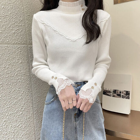 袖と襟にレースがついたフェミニンなハイネックニットトップス