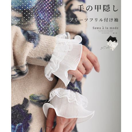 付けるだけで手元が華やぐレースとプリーツフリルの付け袖。袖口にプラスするだけでおしゃれなレイヤード風コーデに変身します。シンプルな長袖のトップスやワンピースなどのポイントに。繊細なレースや滑らかなプリーツが女性らしさを惹きたてます。年齢と共に気になる手の甲をさり気無く隠してくれます。