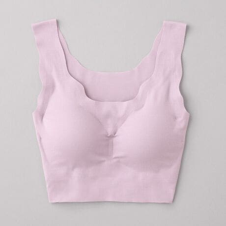 縫い目が無い、肌にやさしいハーフトップです。生地を立体的に加工することで、バストの丸みをつぶさず、バストの丸みをキープします。縫い目が無いので肌への刺激を軽減します。アンダーにはゴムが無く、締め付け感が軽減され、ラクな着用感です。