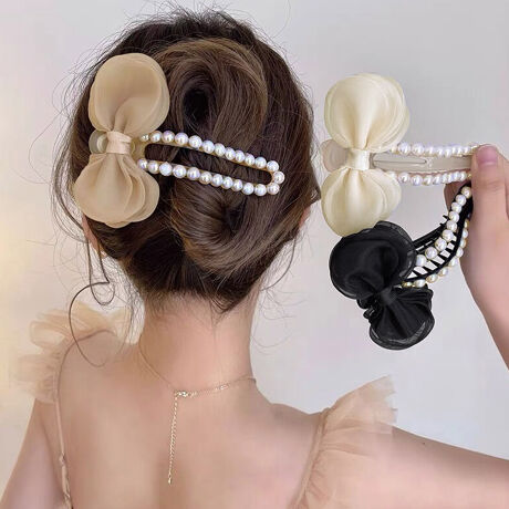ゴージャスでフェミニンなフェイクパール付きリボンモチーフヘアクリップ。