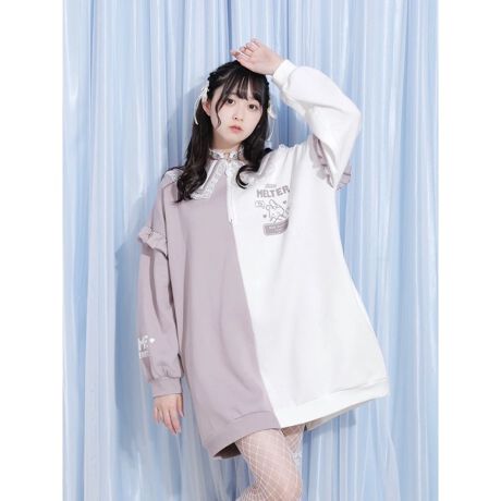 アシンメトリーな配色が抜群の存在感を放ちます。袖のフリルやプリントデザインがキュートなポイント!