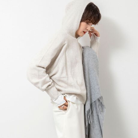 ・ふわふわした柔らかくヘアリーな素材のフード付きニット