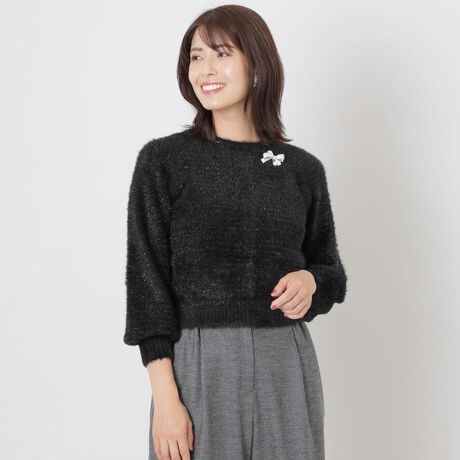 フェザーモール糸とフィルム糸をツイード状に編んだ、TO BE CHICらしいプルオーバーとカーディガンの前後着用可能な2WAY仕様のショートトップスです。
