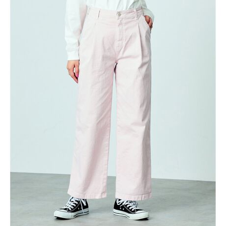 腰回りにゆとりを持たせたワイドシルエット。ウエストにはタックを施し、気になる腰回りをカバー。ワタリからスソにかけてストンと落ちるストレートレッグは、コーディネートしやすい万能シルエット。ハイウエストながらも、リラックス感のある穿き心地と素材のストレッチ性でストレスフリーな穿き心地もポイントです。