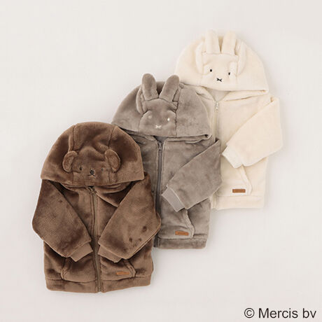きれいな光沢感とあたたかみのあるフェイクファーの風合いが可愛いWEB限定のブルゾンです。フードにはアイボリーとモカ茶にミッフィー、茶にボリスをデザインしました。フロントジップ仕様で着脱しやすく、デイリーユースのアウターにも大活躍。裏地にすべりの良い生地を使用しており、重ね着がもたつかないのもうれしいポイントです。内側にはお名前を記入できるタグつき。【透け感】透けない【生地の厚さ】厚い【伸縮性】なし【裏地】あり【ポケット】あり≪重さ≫ 90cm/約245g