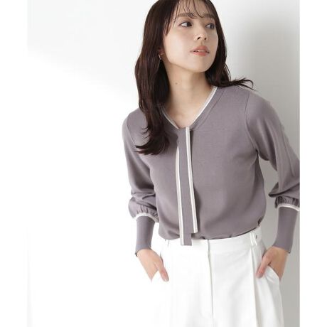 [design & styling]配色カラーが引き立つボウタイニット。ネックラインから続く細めのボウタイには、さり気ない2色のバイカラーを効かせ、ジャケットインにも映えるオフィスシーンにおすすめの1枚。リブを長めにとったマトンスリーブデザインで、袖口のバイカラーもほどよいアクセントに。ベーシックなオフ・チャコールベースにプラスして、春らしいブルーベースは爽やかでフェミニンな印象。オフ系のセットアップとも好相性です。[fabric]キレイめのレーヨンナイロンストレッチ糸を、天竺編みで仕上げたニットです。※モデルの着用画像の場合、光の当たり具合により、実際の色味と異なって見えることがございます。色味は、商品単体の画像をご参照ください。