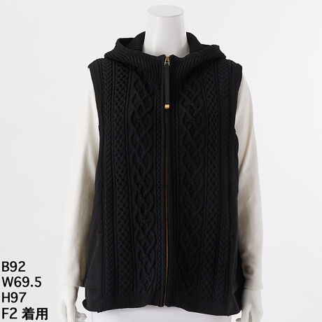 [型番:50521]前身頃、フード部分ケーブルニットのドッキングベスト、後ろ身頃にタックを入れたゆったりシルエット、裾部分ボム入りでボリューム調節可能、