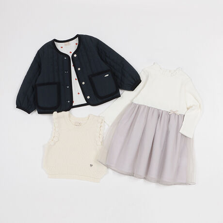 甘さと上品さの両方を楽しめるGIRLS福袋3点セットです。ノーカラー仕様で汎用性が高いアウターは、裏地にハート柄の生地を採用。表面にも要所にパイピングをほどこして、風合いに表情をつけました。ワンピースには着崩れしないドッキングデザインを選び、1枚でサマになるアイテムに。チュール素材の軽やかさも相まって、ドレスシーンにもマッチします。ポコポコとしたモチーフが可愛いアクセントになったニットは、ご自宅で洗えるマシンウォッシャブル仕様に。お手持ちのシャツやTシャツに重ね着するだけでトレンド感を演出してくれます。内側にはお名前を記入できるタグつきです。【透け感】透けない【生地の厚さ】普通【伸縮性】あり※アウターは伸縮性なし【裏地】なし※アウターは裏地あり【ポケット】あり※ワンピースはポケットなし【アジャスター】なし ≪アウターの重さ≫90cm/約180g