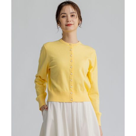 ■デザインぴったりしすぎないシルエットのクルーネックカーディガンは、あえて小さな襟とコンパクトな着丈にすることで洗練された印象に仕上げました。首や肩が美しく見える絶妙なサイズ感で、少し多めにつけたパール釦は、シンプルなデザインのチャームポイントに。釦を全部留めてプルオーバーのように着るのもおススメです。