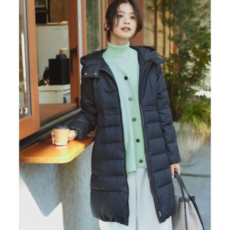 ■デザインウェストにかけてなだらかにシェイプしたキレイなシルエットにこだわったロングダウンコート。身頃の上身部分は、ステッチを入れずフラットな表情にし、カジュアルすぎない印象に仕立てています。ウェストよりもやや高い位置から裾にかけて入れた横段ステッチは、ウェストに向かって間隔をせまくすることで、ラインを細く美しくみせてくれます。ヒップもしっかり隠れる丈感なので、暖かさも抜群です。スリット感覚でサイドに入ったファスナーを開けば、ふんわりフレアスカートもすっきりと着れ、足さばきも◎。デザイン的にも機能的にも考えられた仕様です。顔周りを包み込むような立体感のあるフードは小顔効果も期待できます。シンプルなデザインだからこそ細部までこだわりました。コーディネートのしやすさも魅力。