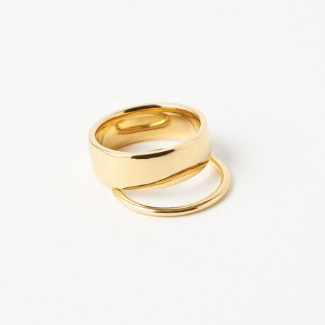 重ね付けをお楽しみいただけるよう、極細のラインタイプとボールド型の、太さの異なる2種類のリングがセットになったデザイン。