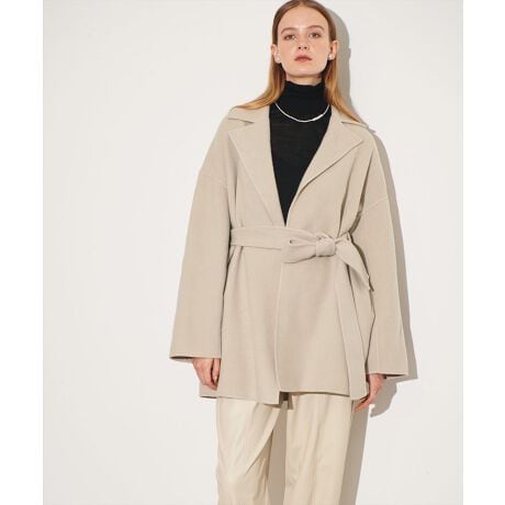 ボタンのないローブタイプで、ベルトで前を閉じたミニマムな装いから