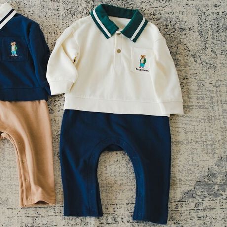 【ベビー/テディベア】ポロシャツ重ね着風長袖カバーオール