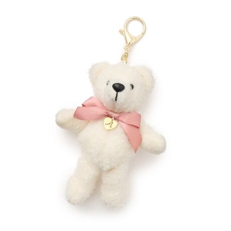 首元にカラーリボンとハートのイニシャルプレートがついた、愛らしいクマのマスコットチャームです。