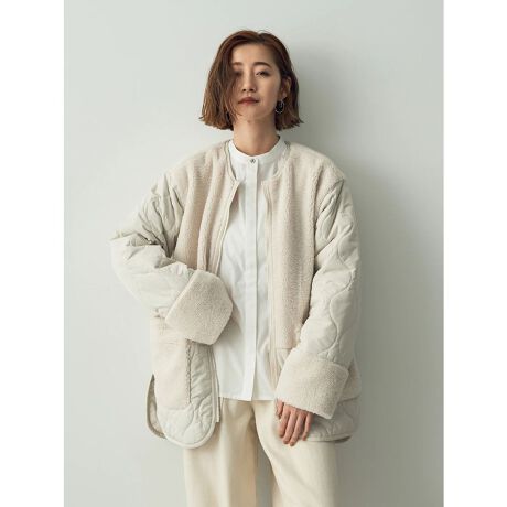 ボア×キルティングの異素材コンビで仕上げたミドル丈コート。