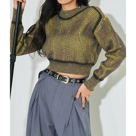 幾何学柄 スプレーライン クロップド 起毛 ニット セーターハイネック 長袖