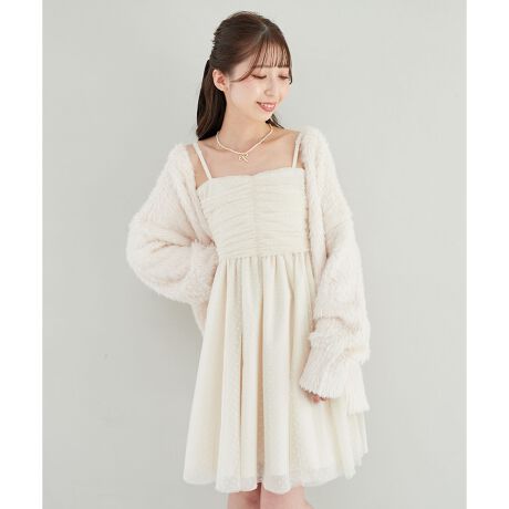 ふわふわのシャギーニットカーディガンを羽織ればあざとコーデの完成です。