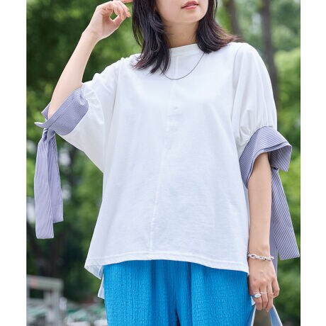 カフス部分は、そのまま垂らしたり、結んでリボンのように見せたりと好みに合わせてアレンジ可能。袖口に布帛を使用しているので、カジュアル見えしすぎずキレイめコーデにも合わせやすいのがポイントです。