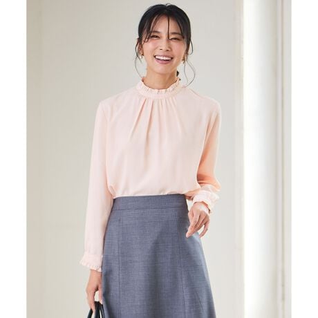 身頃はシンプルに、襟と袖口にはフリルをあしらい、アクセントをプラス。1枚でも着映えるデザインに仕上げました。シーズンやシチュエーションによって、ジャケットやアウターにも上品に合わせて頂けます。クリーンなホワイト(#001)、フェミニンなピンク(#012)シックなネイビー(#075)の3色展開です。