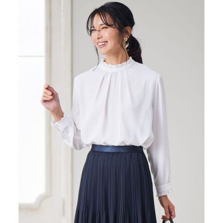 身頃はシンプルに、襟と袖口にはフリルをあしらい、アクセントをプラス。1枚でも着映えるデザインに仕上げました。シーズンやシチュエーションによって、ジャケットやアウターにも上品に合わせて頂けます。クリーンなホワイト(#001)、フェミニンなピンク(#012)シックなネイビー(#075)の3色展開です。