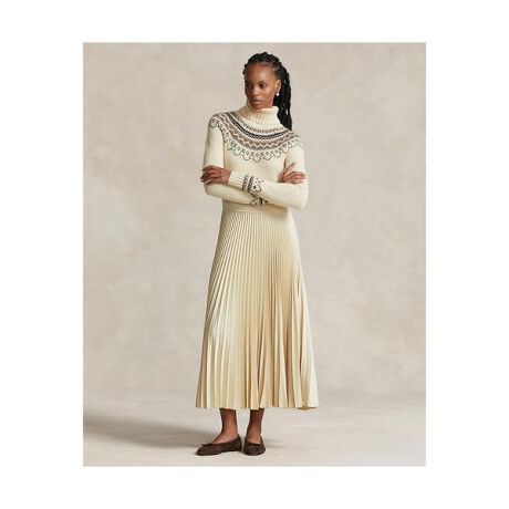 ウール混紡素材で編み上げたセーターのトップス部分と、プリーツ入りのシャムーススカートを組み合わせた、フィット & フレアのタートルネックドレス。フェアアイル編み風のモチーフがネックラインとカフスにアクセントをプラス。・フィット & フレアのシルエット / くるぶしよりやや上の着丈・リブのタートルネック / プルオンスタイル / 長袖のラグランスリーブ、リブカフス・サンバーストプリーツ スカート / 裏無しを使用した商品・モデル身長178cm、着用サイズS※注意:柄の配置は、商品によって異なります。 【素材】・本体上部分:毛 42%、アクリル 30%、アルパカ 24%、ポリウレタン 1%、その他繊維 3% デザイン部分:毛 45%、アクリル 30%、アルパカ 25% 本体 下部分:ポリエステ 100%【生産国】中国
